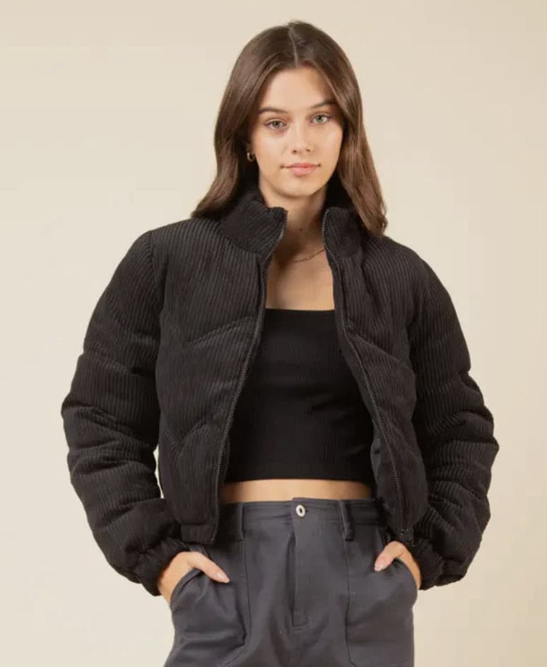 A black corduroy puffer jacket with bold texture and cozy structure. The Raven Puffer blends warmth with edge—made to elevate your cold-weather fits with statement style.