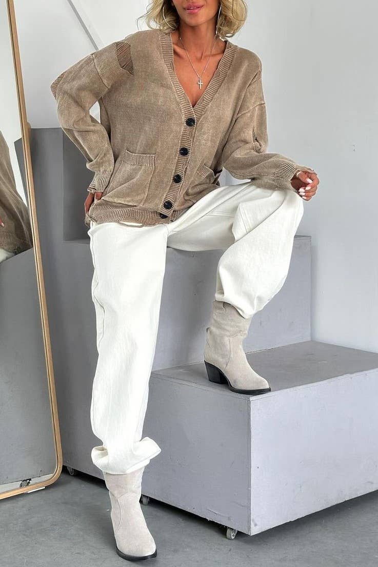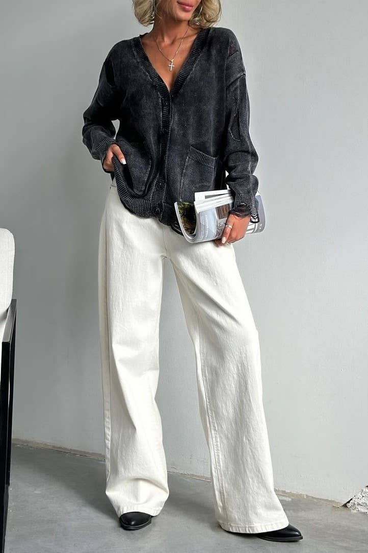 A washed, distressed knit finished with a raw hem for effortless edge. The Fray Cardigan is equal parts cozy and undone—perfect for layering when you want comfort with a statement.