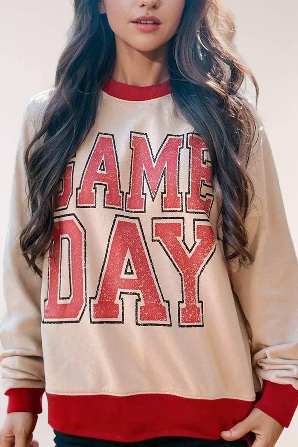 An oversized varsity-striped sweatshirt with bold GAME DAY lettering. Cozy, casual, and full of spirit, The Sideline Crew is your go-to for effortless game-day looks—or off-duty fits with a sporty edge.