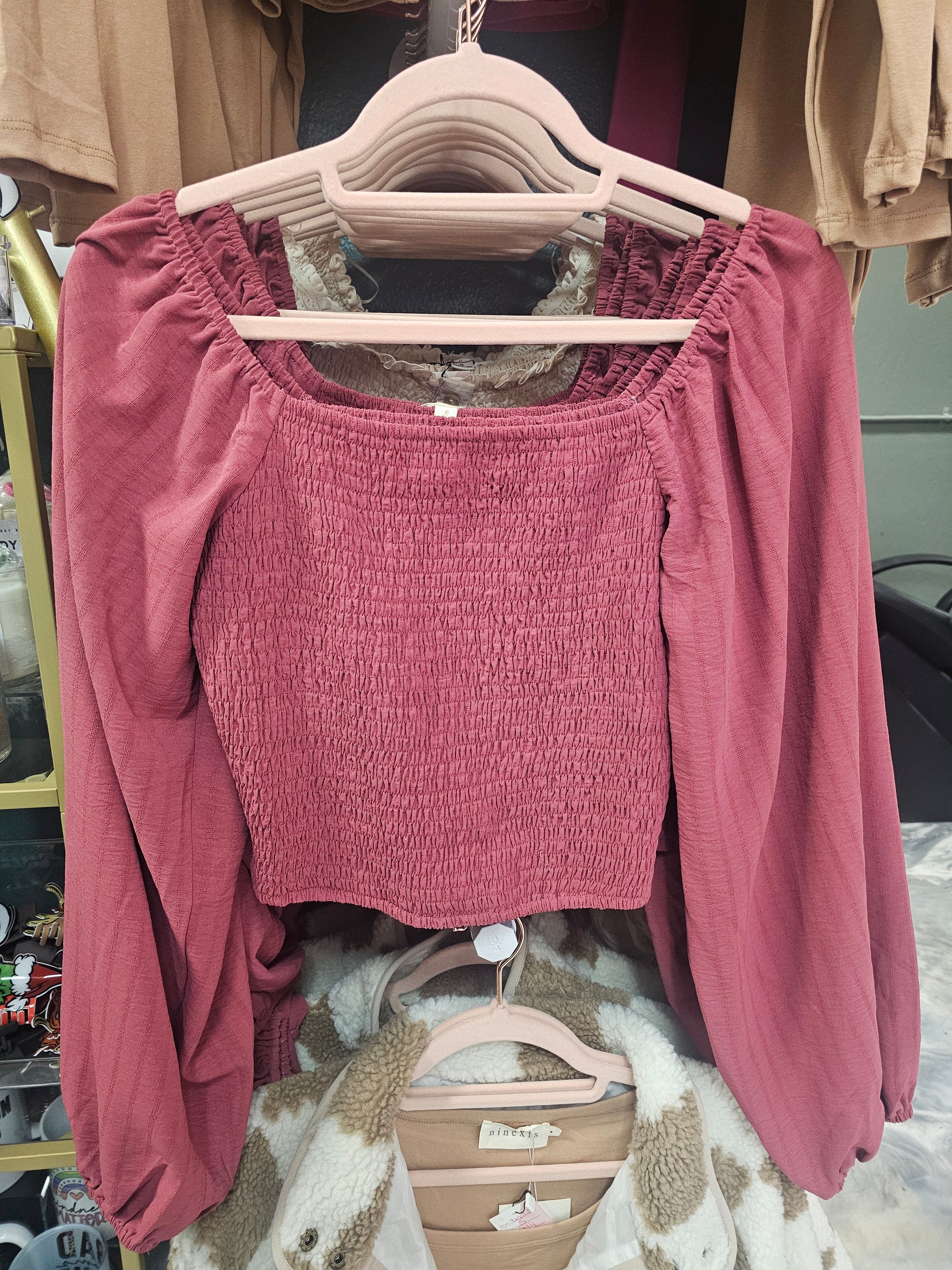 A mauve smocked square-neck top with feminine detail and flattering fit. The Blush Muse Top blends softness with edge—perfect for pairing with denim, layering with jackets, or styling for a romantic, elevated look.v